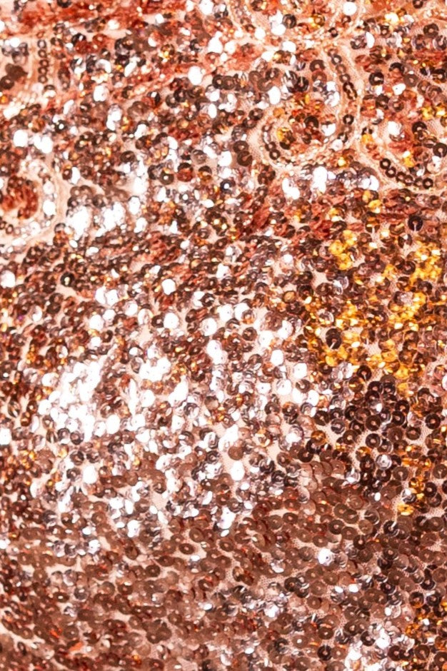 Introducing our 1920's Charlize Gatsby Dress in Rose Gold, a true Great Gatsby showstopper exuding incredible wow factor. Its medium-length design features complete coverage of shimmering rose gold sequins and beads, promising to turn heads on any occasion.
